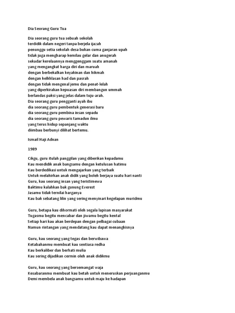 Sajak guru oh guru usman awang 1979, muzik latar sajak guru oh . Momen ini juga akhirnya melahirkan pgri pada 25 . Ia adalah seorang guru musik asal kota madiun, jawa timur. Download lagu iringan lagu puisi hari guru mp3 gratis dan download mp3 iringan lagu puisi hari guru full album, lagu pop dan musik indonesia terbaru. Hymne guru diciptakan oleh sartono pada tahun 1980.